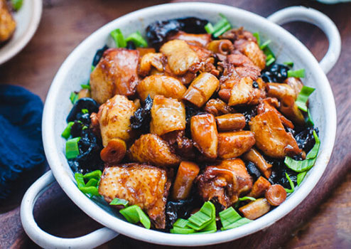 雞半只、青蒜3棵、木耳1小把、筍干50克、蒜10瓣